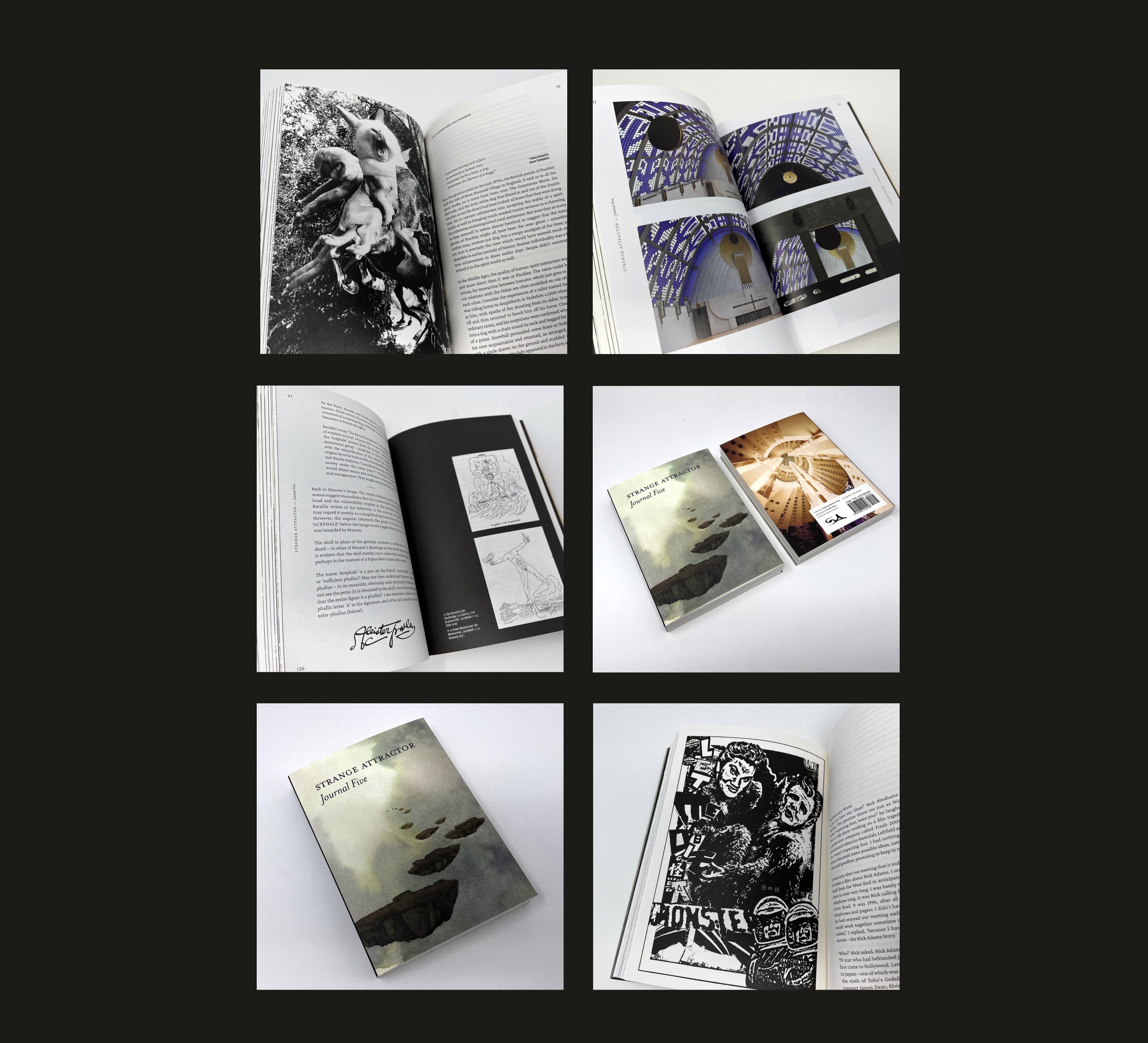 Featuring essays from academics, artists, enthusiasts, and sorcerers, Journal Five explores matters including the occult origins of the dissident surrealist secret society the Acéphale; the dark cosmological mysteries of Bremen’s Haus Atlantis; a provisional taxonomy of animals with human faces; a twentieth-century crucifixion on Hampstead Heath, speculation on the creation of one of the most famous pieces of cave art, and an unpublished horror script by David MacGillivray and Ken Hollings.