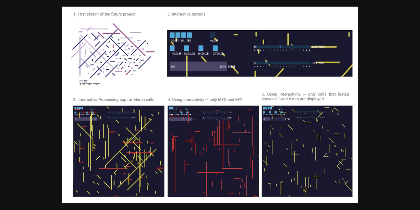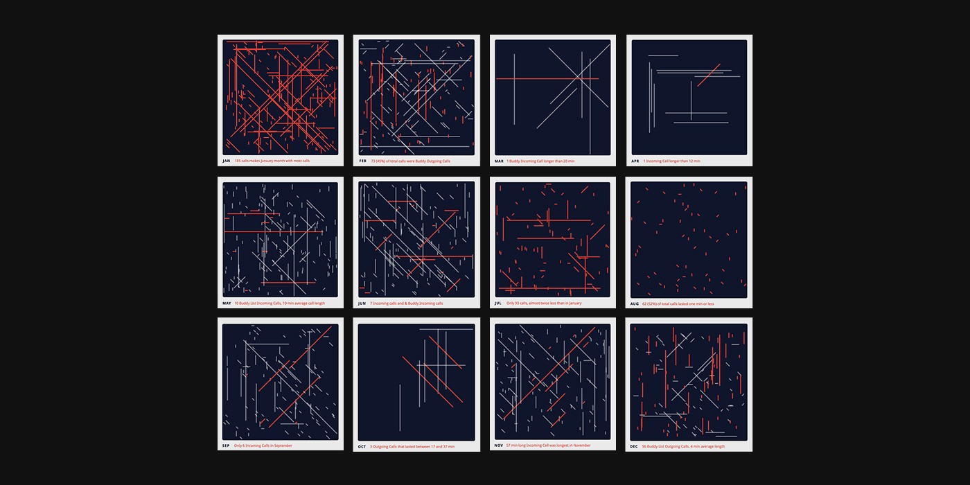 Patternholic Processing app was made to visualize phone call data from an anonymous user in Ontario, Canada. I was provided raw data for a year of phone calls, along with information on which date where they made, at what time, where was the call made from, what number and location where called, how long did it last and what call type (myo, out, inc, myi) and tariffe was used (day time/night time/ weekend time). My task was to take a data driven approach and therefore create visualization that does not put user but data in the first plan.