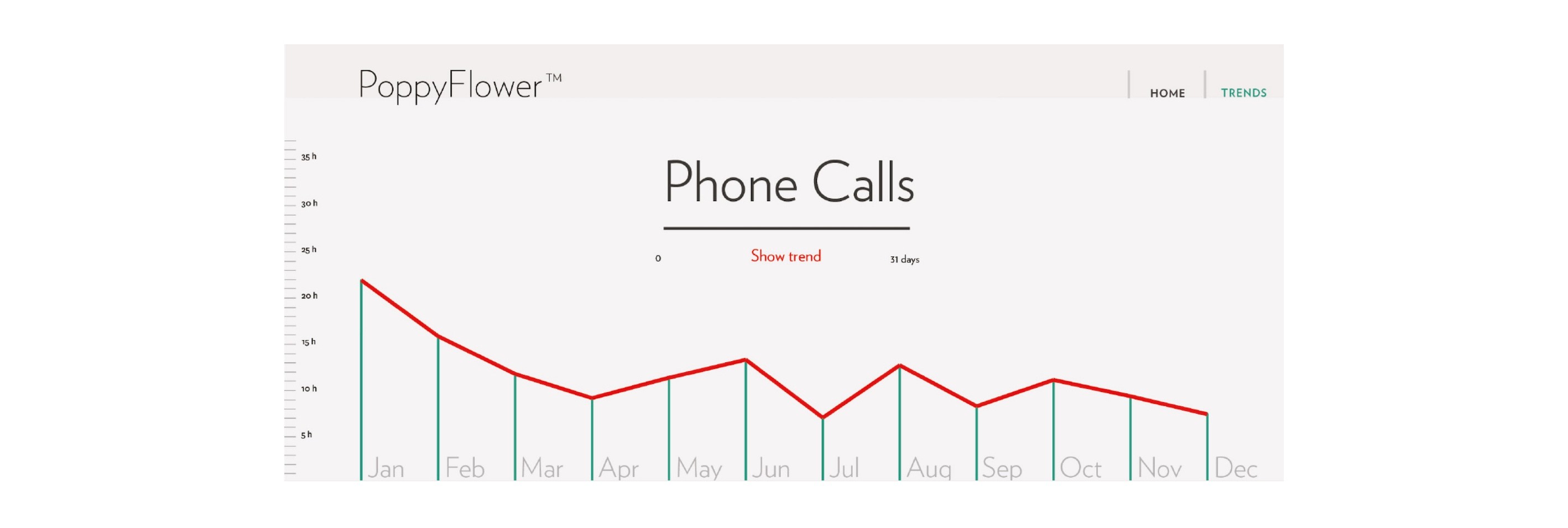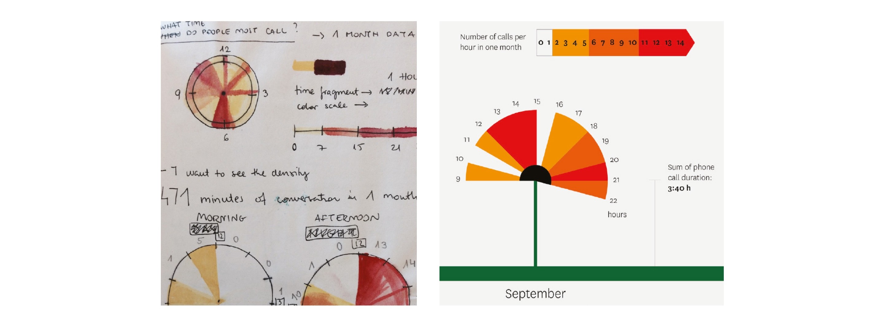 The goal was to visualize a question in my mind ‘At what time of the day do people most call?’. Enclosed is my first sketch of the future project, in the notebook with watercolors. The model represents phone data for September: the left pie chart is for morning calls, and the right one for afternoon ones. Colour varies from yellow to red, according to how many calls were made in that hour during that month. I created the idea in Illustrator and named it PoppyFlower, due to the fact that it turns red when many calls are made during a certain hour. Project created at York/Sheridan School of Design.